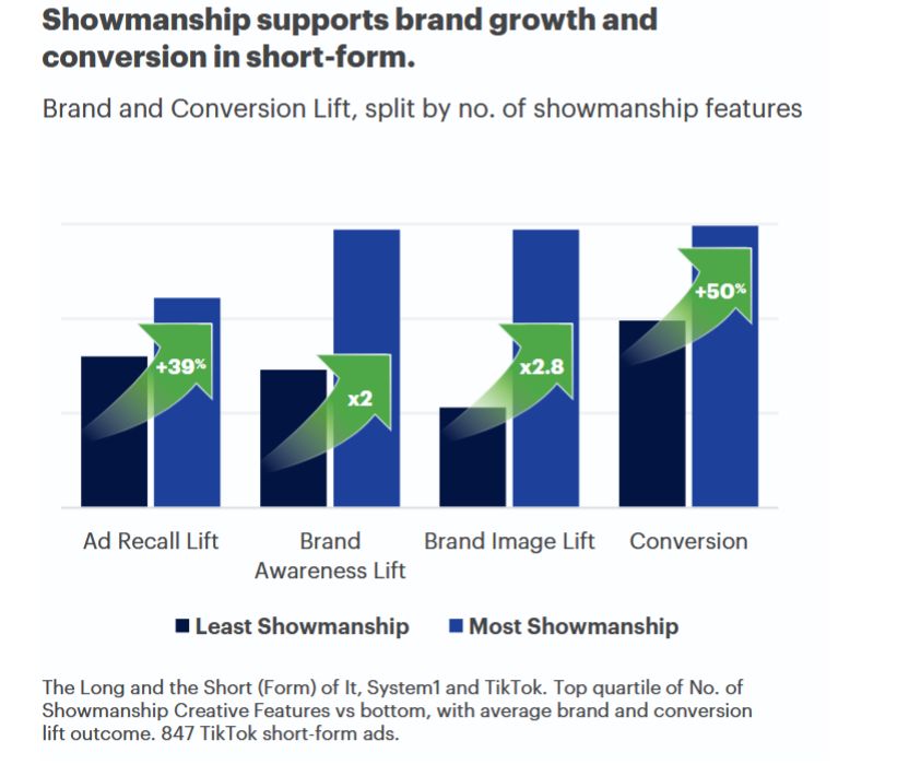 По результатам исследования System1 и TikTok, зрелищная реклама увеличивает запоминаемость на 39%, конверсии на 50%, а осведомленность в два раза.
