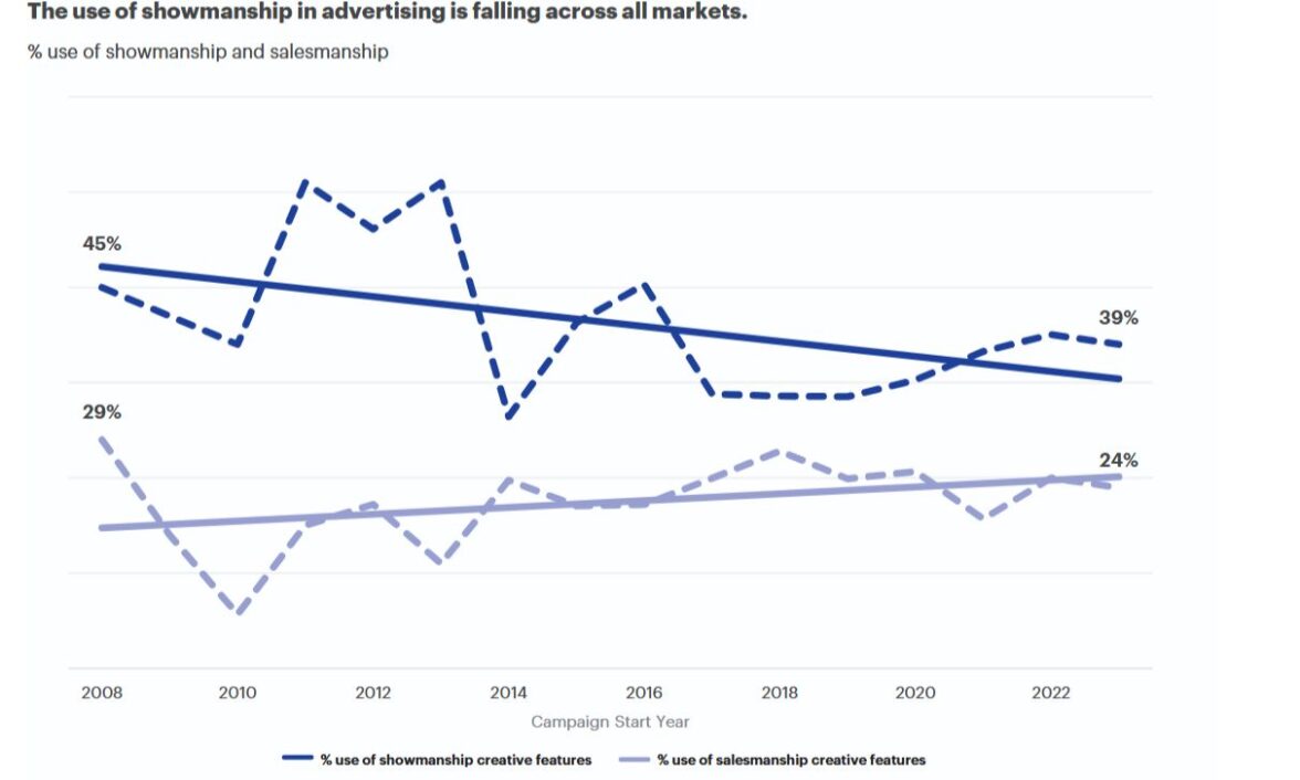 При этом количество зрелищной рекламы в потоке заявок на Effie падает. Если в 2008 году ее доля в общем количестве кейсов была 45%, то 2023-м — 39%. Как авторы отчета определяли, какая реклама зрелищная, а какая нет, не указано.