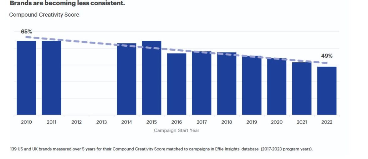 Тем не менее бренды становятся менее последовательны в рекламе. Если в 2010 году 65% кампаний, поданных на Effie, были последовательны, то в 2022 году — 49%.