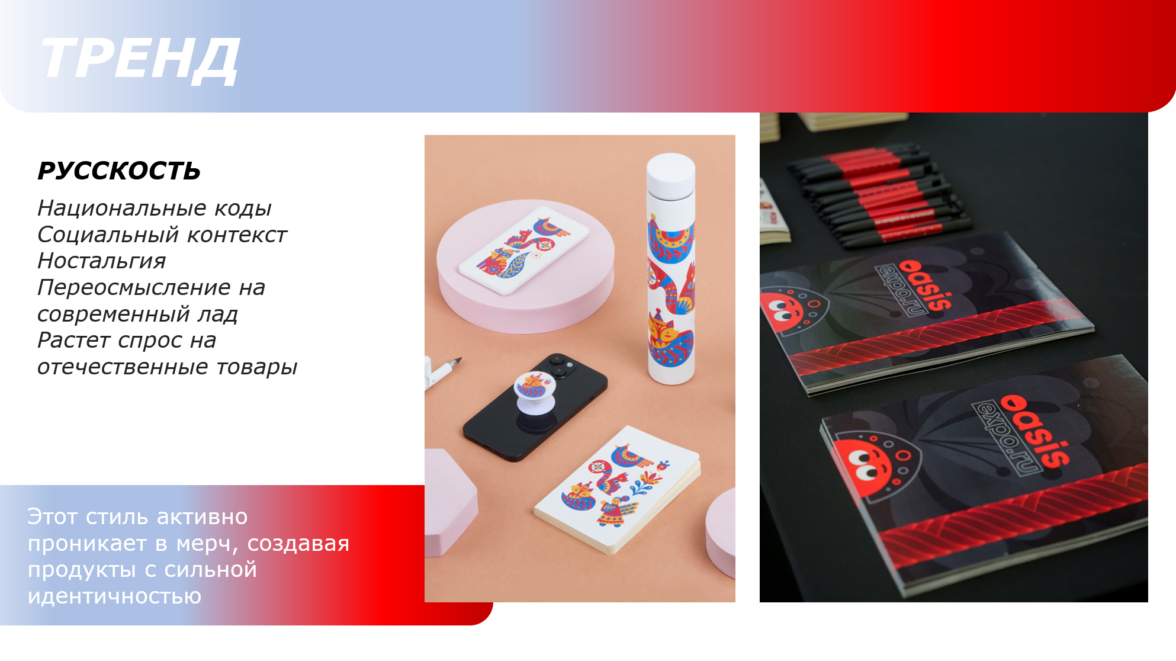 Также немаловажно, что этот тренд становится драйвером импортозамещения. Например, за последние три года ассортимент российских товаров в Oasis вырос в 3 раза. Рост спроса на отечественные товары в корпоративном и туристическом сегментах, в свою очередь, стимулирует развитие российского производства, ведь это постоянный поток крупных заказов с понятной емкостью и нишей.