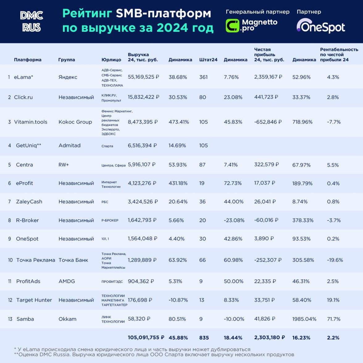 В топ-3 рейтинга также вошли Click.ru (15,8 млрд рублей) и Vitamin.tools (8,5 млрд рублей). При этом eLama сохраняет значительный отрыв от ближайших конкурентов, подтверждая статус крупнейшей платформы для малого и среднего бизнеса в России.