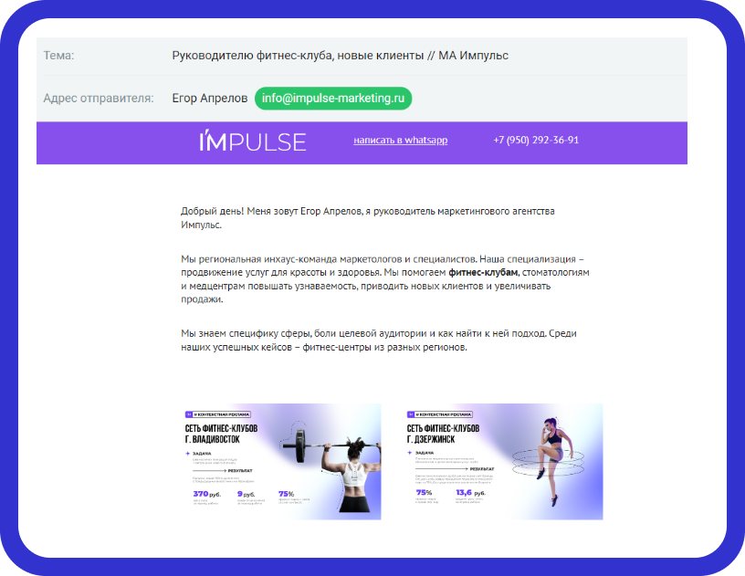 Какой результат? Формат личного письма очень хорошо зашёл. Такая рассылка в итоге принесла нам около 10 запросов потенциальных клиентов.