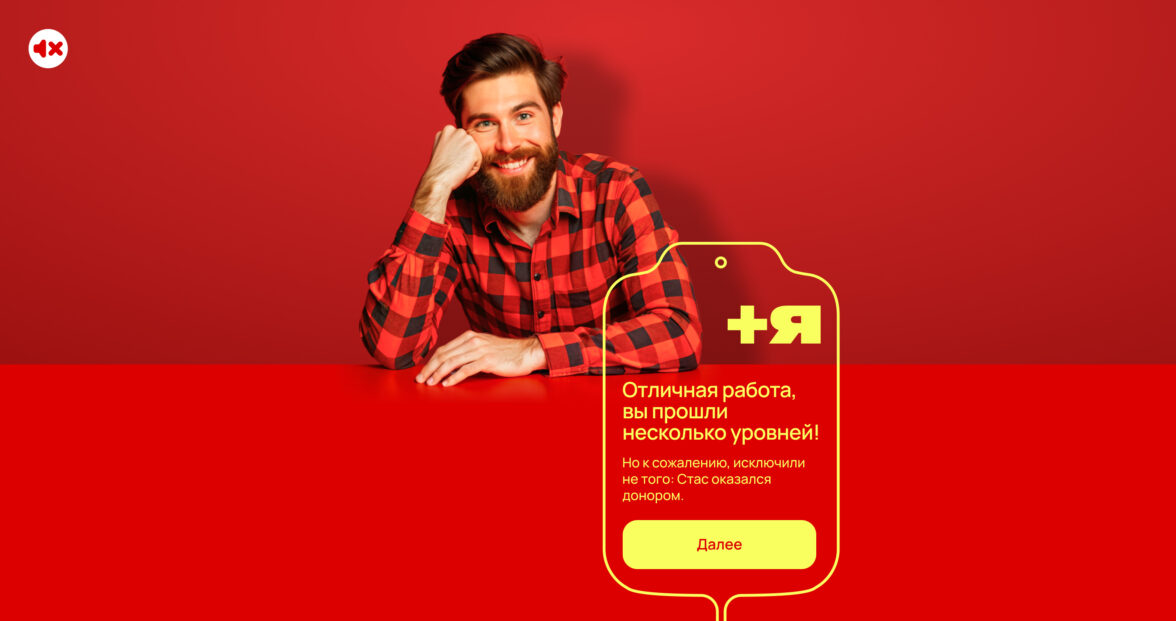 Вся коммуникация вела на mobile-first платформу донорствоплазмы.рф созданную для удобного и увлекательного знакомства с донорством. Здесь пользователи могут найти полезные материалы, пройти онлайн-тест, определяющий возможность стать донором, и даже попробовать себя в детективной игре, которая помогает сделать первый шаг к осознанному донорству. Вся информация представлена простым, понятным языком в ярком и интерактивном формате, который действительно резонирует с молодым поколением.