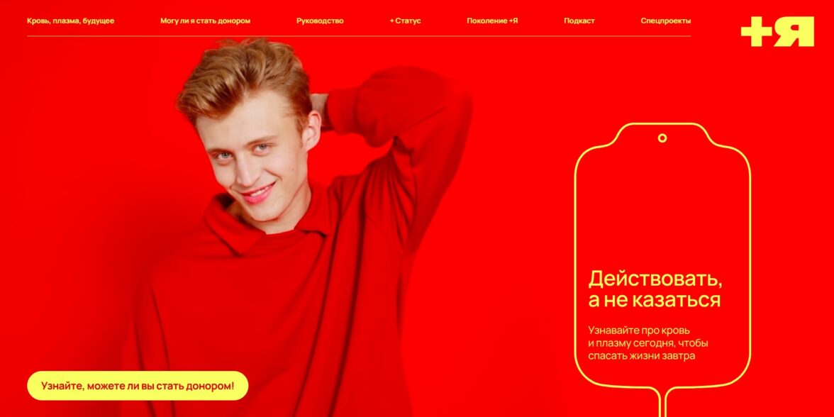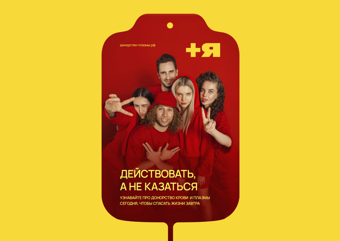 Яркий и запоминающийся брендинг стал визуальной основой кампании. Красно-желтая айдентика отражает цвета крови и плазмы, и является метафорой энергии и динамики, сразу привлекая внимание молодежи. Логотип +Я символизирует присоединение к сообществу осознанных доноров и подчеркивает личный вклад каждого. Нейминг проекта возник из ассоциации с английским «plus me», созвучным со словом «плазма», и работает как призыв стать частью движения. Визуальный образ контейнера для сбора крови стал узнаваемым символом кампании, мгновенно считываемым и запоминающимся.