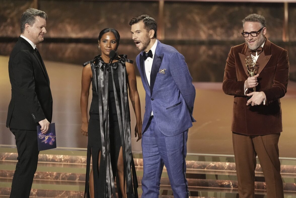 Слева направо: Алекс Грегори, Фрида Перес, Питер Хайк, Сет Роган — лауреаты «Эмми» в номинации «Лучший сценарий комедийного сериала».