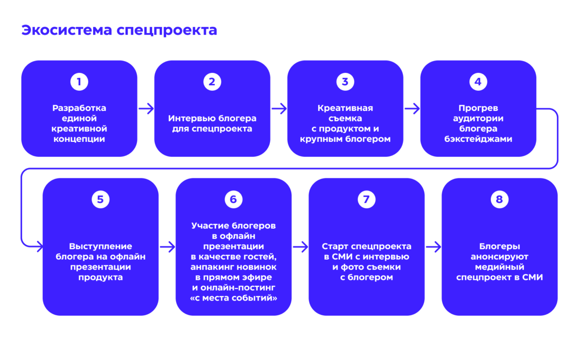 привлечение блогеров, соответствующих целевой аудитории и креативной идее — от лица проекта и амбассадора бренда до микро-блогеров для медийной поддержки;