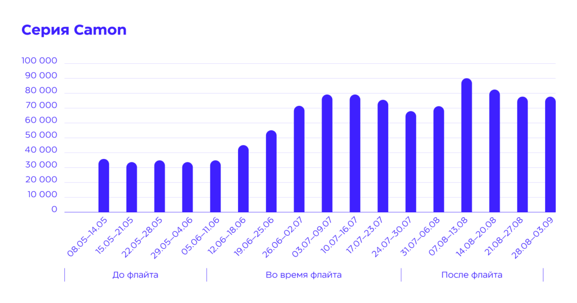 По запросу «tecno camon» во время спецпроекта видим рост запросов, который продолжился и после его завершения. Делаем вывод, что наш спецпроект поспособствовал увеличению поискового интереса всей линейки CAMON на 50%.