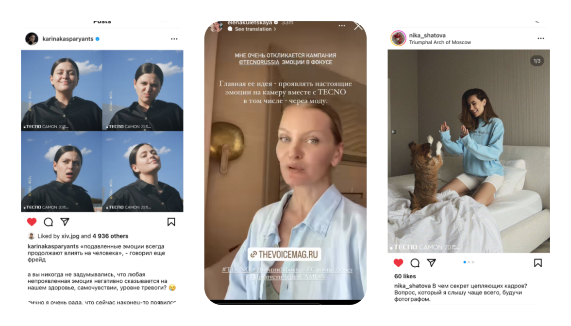 Часть блогеров поддержали проект публикациями со своей интерпретацией слогана «Эмоции в фокусе». Это были блогеры категорий бьюти и фэшн: дизайн смартфона TECNO яркий и необычный, и нам было важно показать его через «ценителей» прекрасного. Эмоциональными постами поделились Карина Каспарянц, Елена Кулецкая, Ника Шатова, Сергей Сухов и другие.