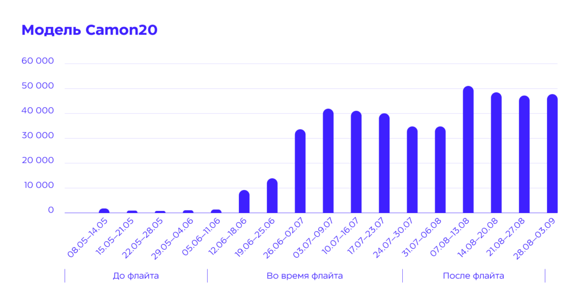 По запросу «tecno camon 20» видим резкий рост со стартом спецпроекта, который органично встроился в другие маркетинговые активности бренда, которые были призваны анонсировать выход новой модели на рынок, и при этом интерес возрастает и после флайта, что говорит об отложенном спросе.