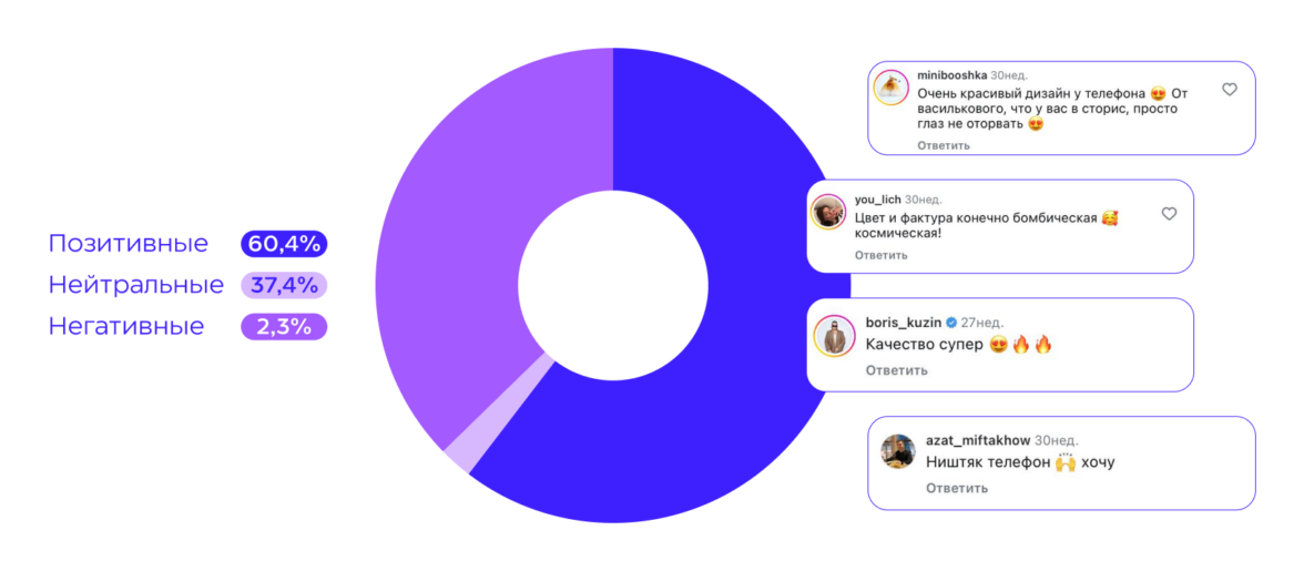 Мы проанализировали тональность комментариев под публикациями блогеров. Всего получили 51 345 лайков и 2 399 комментариев, бренд был упомянут 103 раза. При этом подавляющая часть комментариев носит положительный характер: доля позитива превысила 60%, а негатив составил всего 2% от всех комментариев.