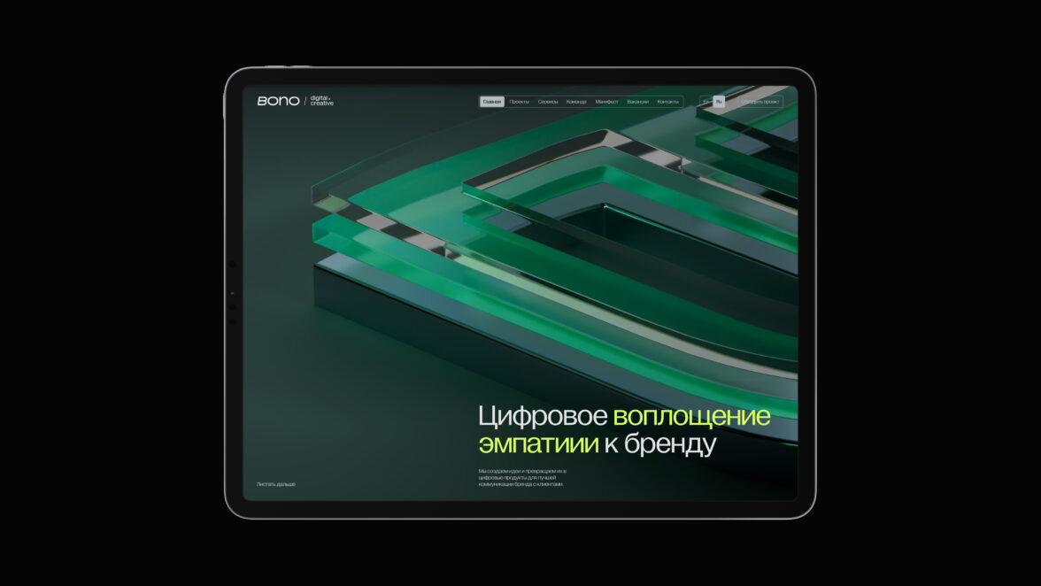 Главным носителем обновлённого бренда стал сайт агентства. Он является 100%-ным отражением эмпатийного позиционирования, его яркий и глубокий визуал, приятная 3D-графика и анимация, лаконичная структура с первых же минут позволяют «прочувствовать» бренд Bono digital x creative, последовательно рассказывает все важные факты об агентстве, описывает сервисы, показывает кейсы, отражает ценности. Профсообщество уже успело высоко оценить этот сайт: он получил 2 награды премии Tagline и попал в число топ-проектов на Dprofile, Behance, CSS Design Awards и на других ресурсах.