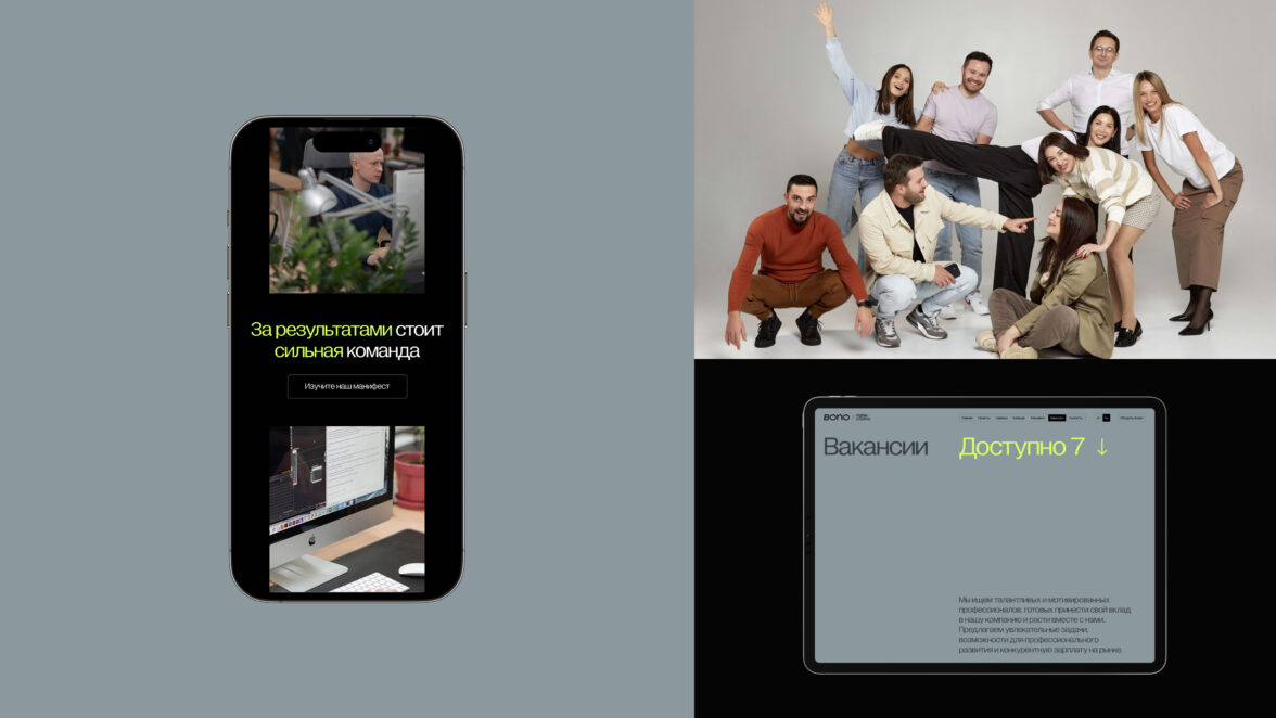 Отдельно стоит отметить, что новый сайт Bono наглядно демонстрирует продукт, на который агентство делает ставку в 2024 году: это low-code и no-code проекты (сам сайт сделан на webflow).