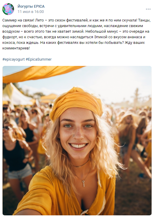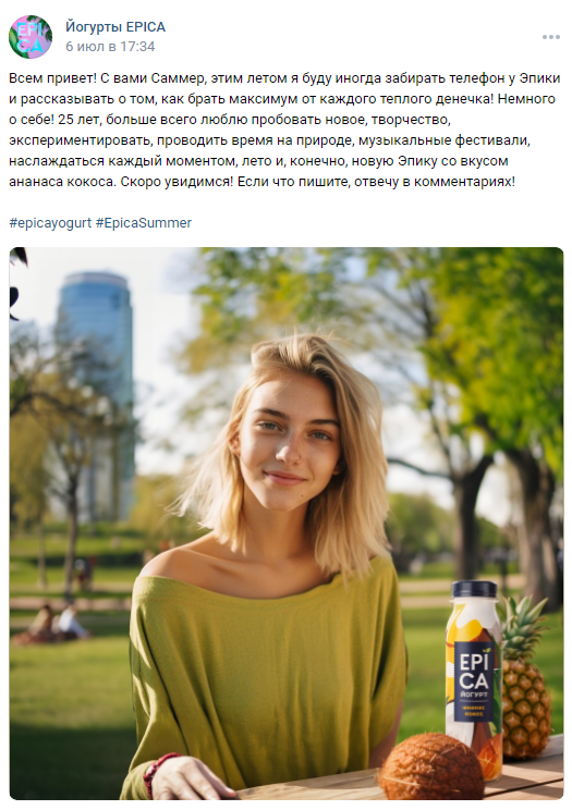 Саммер управляет аккаунтами EPICA в VK, Instagram* и Telegram в июле и августе 2023 года. Девушка делится с подписчиками своими летними приключениями, рассказывает о питьевой линейке бренда и новинке со вкусом ананас-кокос.