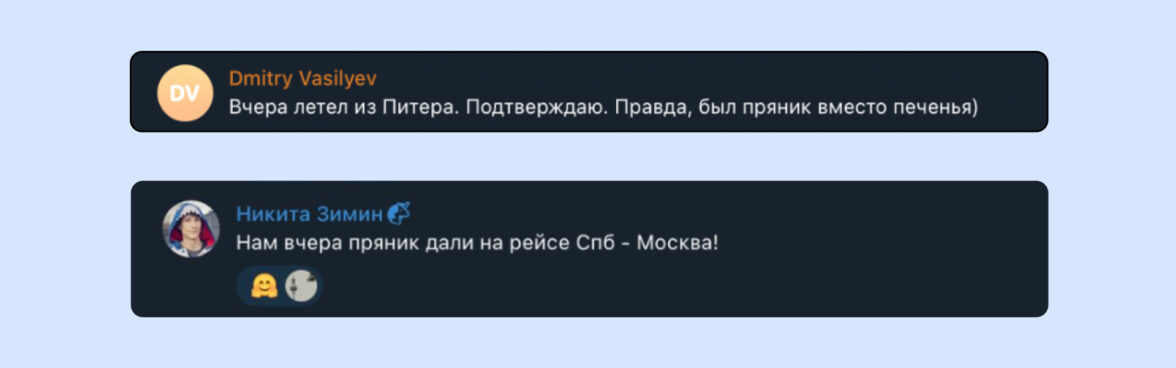 В канале авиакомпании выложили фотку с чаем и печеньками. Автор явно был доволен тем, что теперь дают что-то кроме воды!
