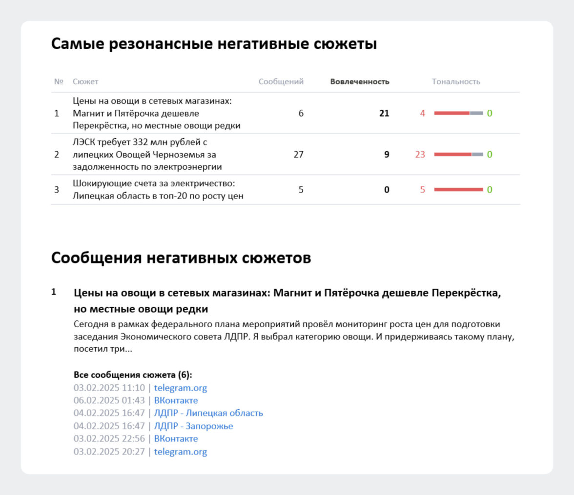 Тональность сюжетов — это новый индекс, доступный только в экспортированных отчётах в формате Word и PDF. Он определяется на основании соотношения количества позитивных и негативных сообщений в сюжете. Объем сообщений одной тональности должен на 20 п.п. превышать объем другой тональности. Если разница между ними меньше 20 п.п, то тональность сюжета — нейтральная.