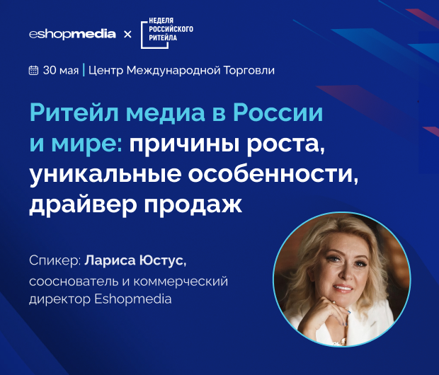 30 мая Лариса Юстус, сооснователь и коммерческий директор Eshopmedia, выступит с докладом «Ритейл-медиа в России и мире: причины роста, уникальные особенности, драйвер продаж».