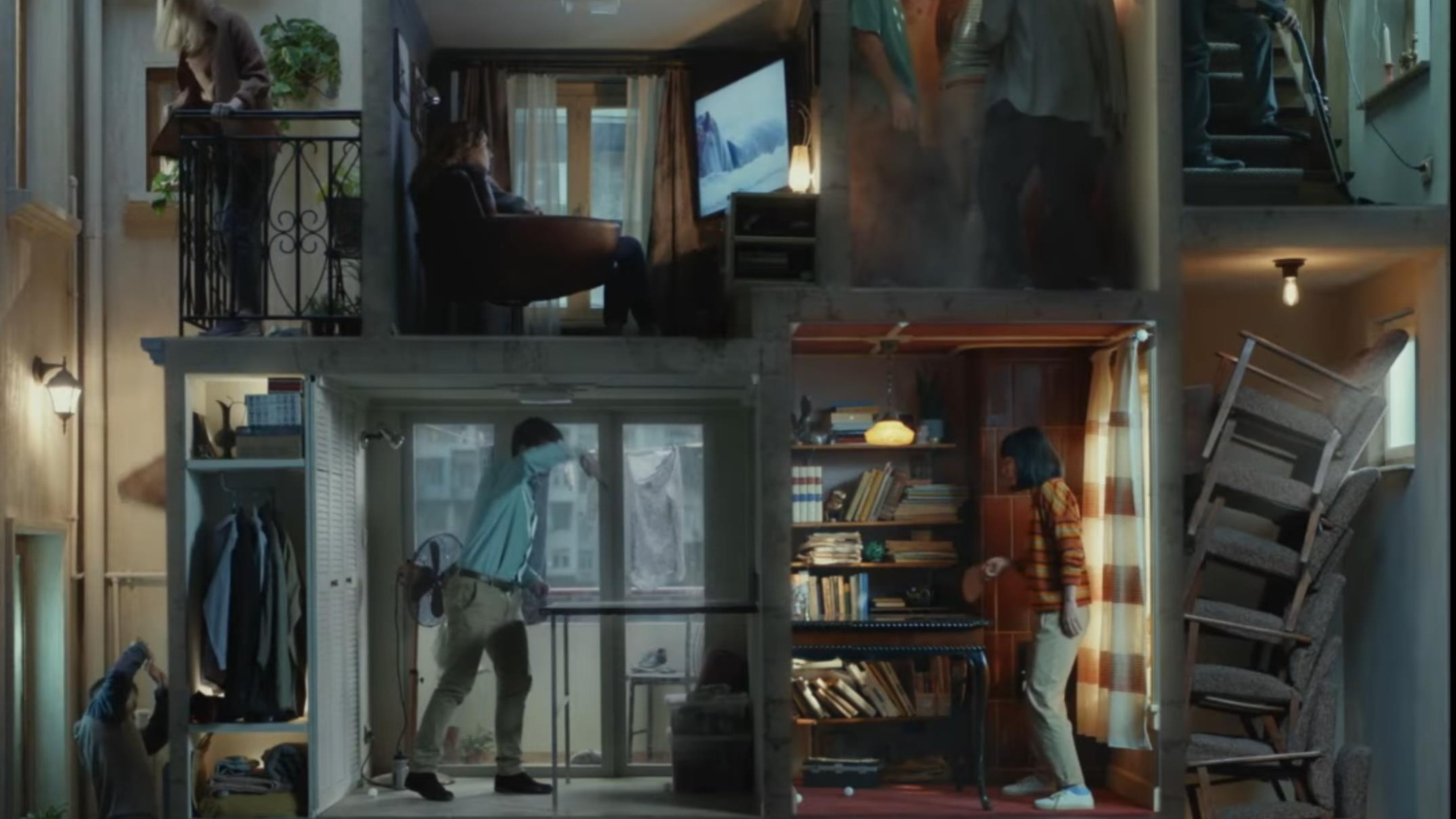 Изобретательный дизайн декораций, которые были полностью изготовлены вручную, только подчеркивает идею: все что нужно, чтобы максимально использовать минимальное пространство, — это творческий подход. Даже формат ролика — 1:1 — говорит о том же.