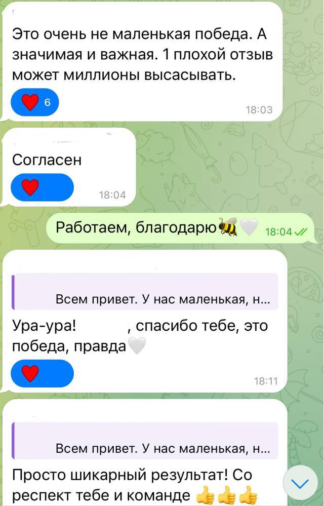 В итоге новые хорошие отзывы поднялись наверх, а тот популярный негативный отзыв ушёл «на дно». Заказчик был в восторге и написал, что разница в продажах с наличием такой жалобы в топе отзовика и БЕЗ неё может составлять для них миллионы рублей.
