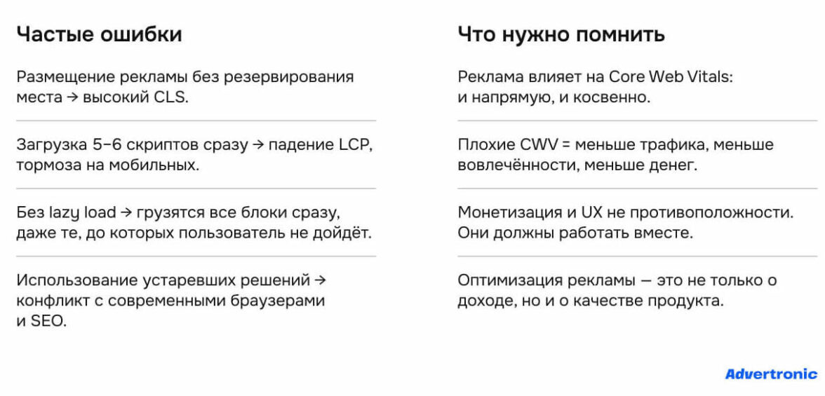 1. Реклама тормозит загрузку сайта (LCP). Большинство рекламных сетей используют внешние скрипты, часто тяжёлые и не оптимизированные.