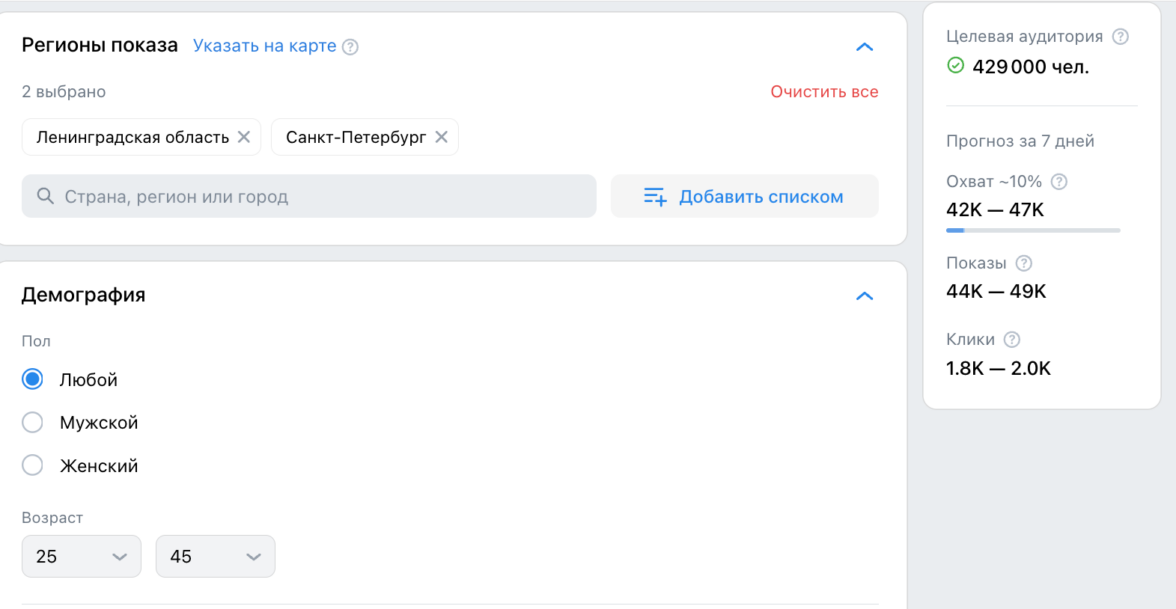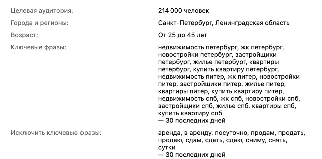 Санкт-Петербурга и Ленинградской области 25–45 лет, которые за последние 30 дней интересовались покупкой недвижимости в Северной столице. Охват по этой