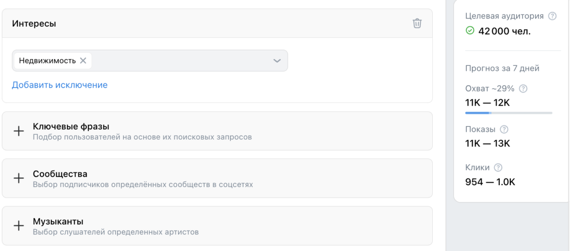По тематическим таргетингам охват в «Одноклассниках» не слишком большой. Так, по интересу «недвижимость» сервис находит всего 42 000 пользователей. Однако в более широких аудиториях (супергео и аудиториях без дополнительного таргетинга) отдельно выбранные кампании по этой соцсети могут приносить качественные обращения в рамках KPI, пусть и в небольшом количестве.