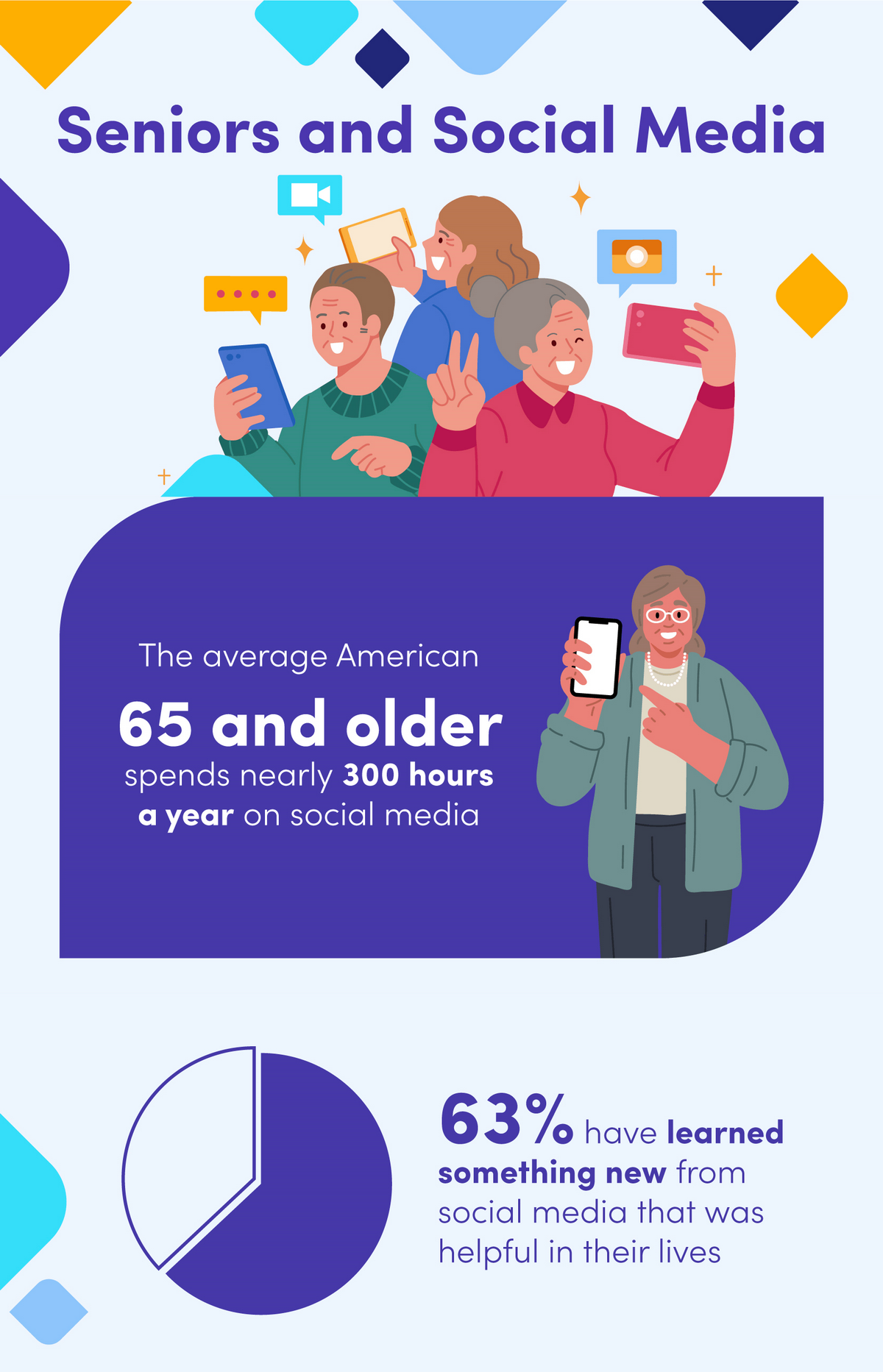 Бытует мнение, что интернет и соцсети интересны и используются только представителями молодого и среднего поколений. Но это не так. По данным американской негосударственной исследовательской организации The Pew Research Center, 45% пожилых американцев пользуются соцсетями. Согласно совместному исследованию страховой платформы ClearMatch Medicare и сервиса опросов OnePoll, американцы в возрасте 65+ лет проводят в соцмедиа в среднем 47 минут ежедневно.