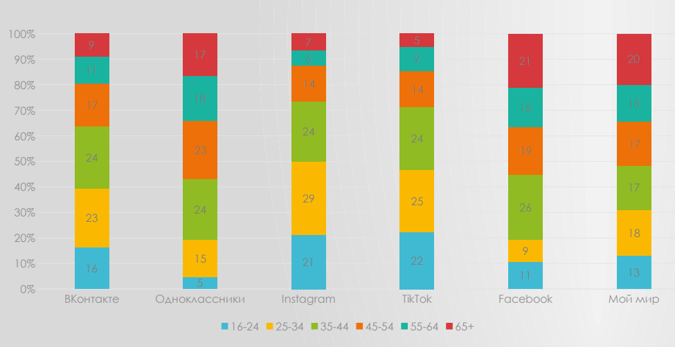 По данным Российской ассоциации электронных коммуникаций (РАЭК) в 2022 году наибольшей популярностью у россиян 65+ были Facebook и «Мой мир», им отдали предпочтение 21% и 20% представителей этой возрастной группы, соответственно. 17% сидят в «Одноклассниках», 9% используют «ВКонтакте», а 7% в Instagram*. Самая непопулярная соцсеть среди российских пенсионеров — TikTok: сюда заходят лишь 5% возрастных пользователей соцсетей.