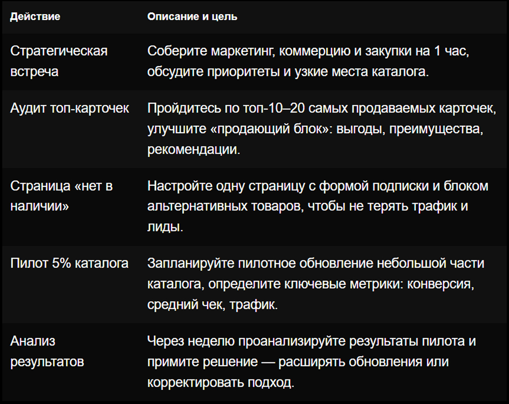 Выберите одну категорию или 5% ассортимента, внедрите улучшения, отследите результат (веб-аналитика, конверсия, глубина просмотра). Если всё идёт по плану — масштабируйте.