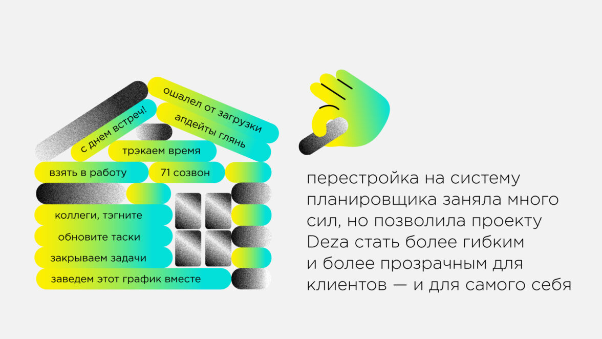 Прежде всего нужно было перестроить мозг коллег, которые до этого никогда не относились серьезно к тому, сколько тратят времени на свою работу, разглагольствуя про поиск вдохновения вне времени. Все прошло не без бунтов, эта синхронизация заняла много сил, но позволила проекту Deza стать более гибким и более прозрачным для клиентов — и для самого себя.