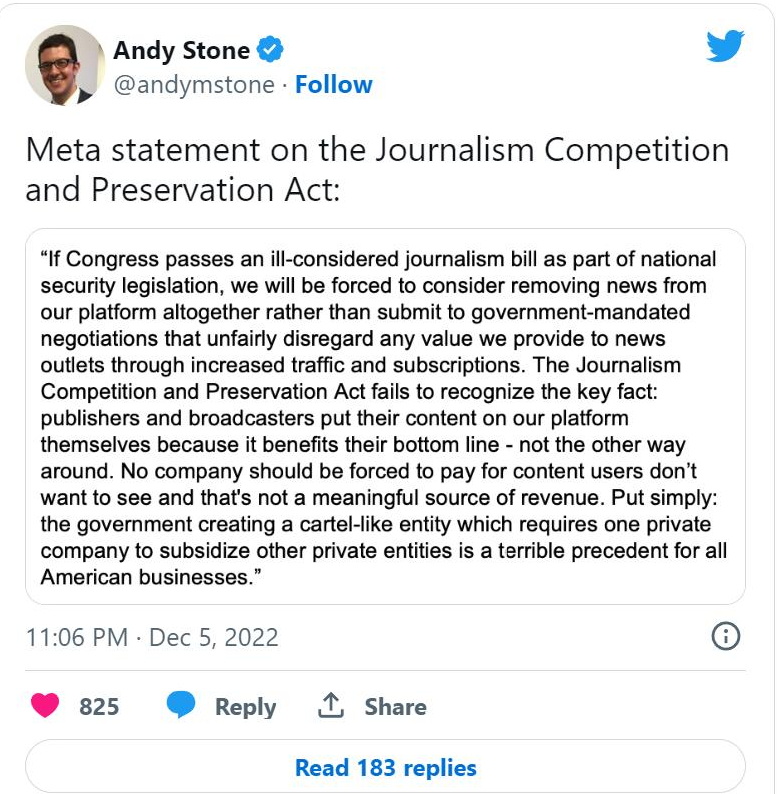По словам Энди Стоуна, главы отдела политических коммуникаций Meta, Facebook «будет вынужден рассмотреть вопрос об удалении новостей» с платформы, если в США будет принят закон «О конкуренции и сохранении журналистики» (Journalism Competition and Preservation Act (JCPA).