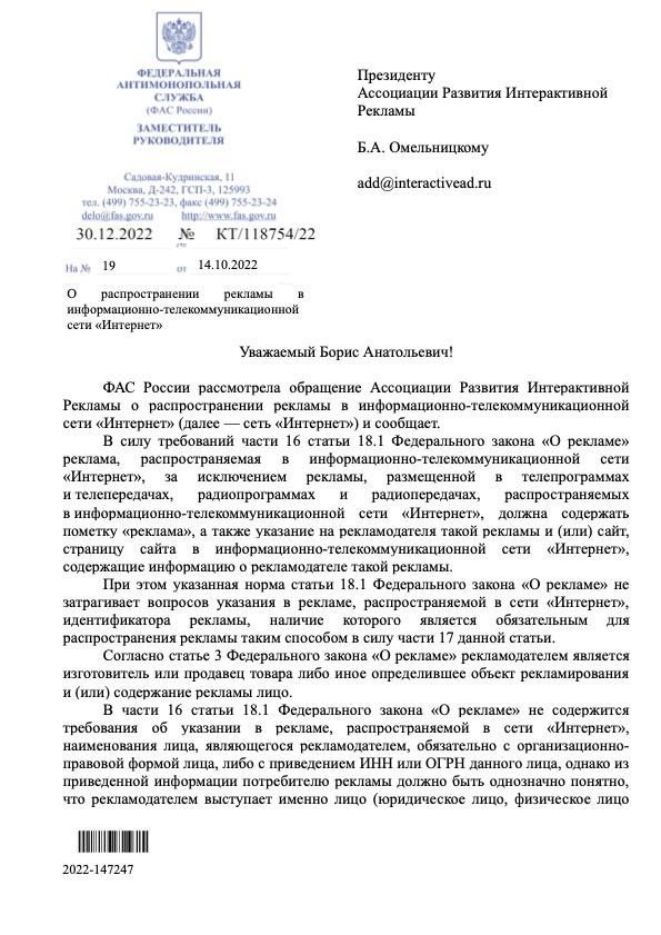 В октябре 2022 года президент АРИР Борис Омельницкий направил официальный запрос заместителю руководителя ФАС Карине Таукеновой (документ есть в распоряжении редакции ADPASS) с просьбой разъяснить, какие способы индивидуализации рекламодателя на рекламном формате соответствуют требованиям нового закона об учете интернет-рекламы. В письме Омельницкий подчеркнул, что этот момент «вызывает большое количество вопросов со стороны участников рынка, приводит к появлению многочисленных противоречивых толкований и разъяснений».