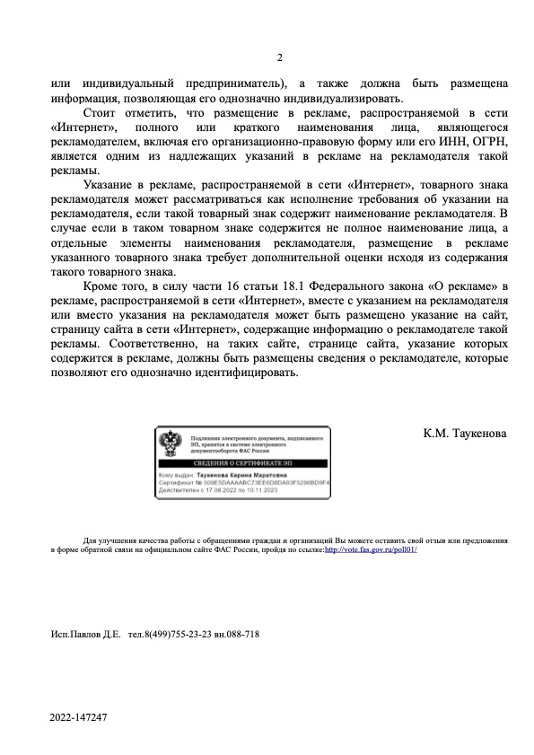 30 декабря в ФАС ответили на обращение АРИР (документ есть в распоряжении редакции ADPASS). Из письма за подписью Карины Таукеновой следует, что для правильной маркировки рекламы не всегда достаточно использовать только один из перечисленных выше реквизитов рекламодателя. В антимонопольной службе согласны, что в части 16 статьи 18.1 закона «О рекламе» действительно не содержится требование указывать в интернет-рекламе наименование рекламодателя обязательно вместе с его организационно-правовой формой, ИНН или ОГРН. Но, подчеркнули в ФАС, из приведенной информации потребителю рекламы должно быть однозначно понятно, кто именно выступает рекламодателем, поэтому размещенная информация должна позволять однозначно его индивидуализировать.
