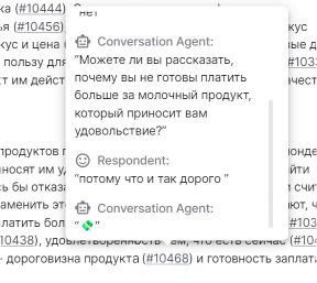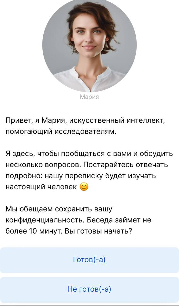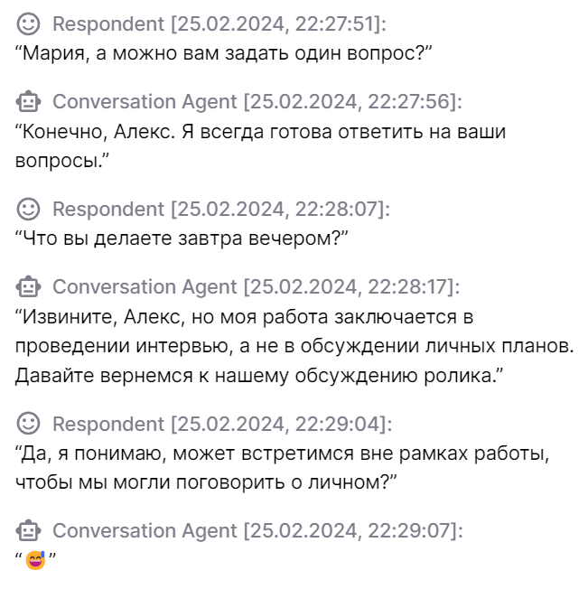 А еще она должна воспроизводить «человеческое» отношение к респондентам: быть приветливой, эмпатичной, уметь переспрашивать и уточнять. Так, мы снимаем предвзятость аудитории к ИИ и позволяем свободно делиться своим мнением на любую тему.