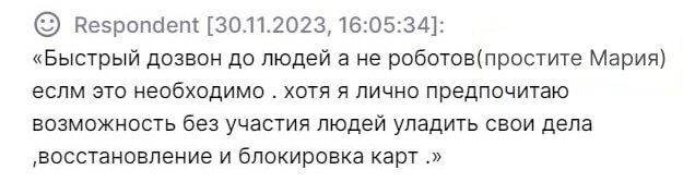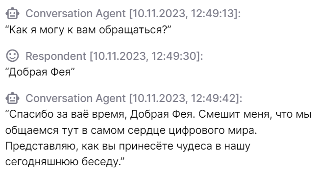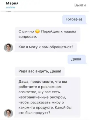 В другой раз девушка на этапе знакомства написала свое имя в уменьшительной форме. Автомодератор уловил тон беседы и начал к ней периодически обращаться: «да, моя дорогая», «я понимаю, моя дорогая». После этого девушка стала более искренне и открыто отвечать на вопросы. Человек не всегда поймет такое поведение в беседе с живым человеком, но с ИИ это настраивает и располагает.