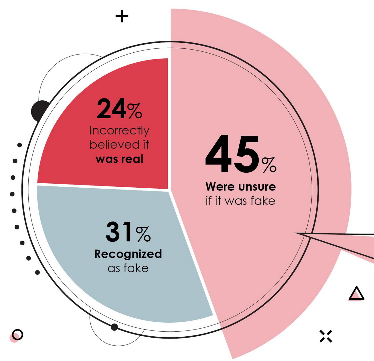 В группе из 1625 человек, которым демонстрировалась ложная информация, фейки смог распознать примерно каждый третий (31%). Примерно каждый четвертый участник эксперимента (24%) поверил в фейк. И чуть меньше половины (45%) не знали, верить или нет.