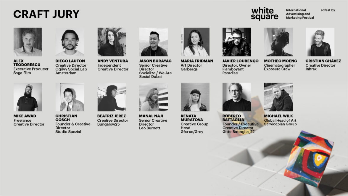 Высокий уровень судейства, профессиональная компетентность и беспристрастность в оценке работ являются одной из сильнейших сторон Фестиваля Белый Квадрат. В этом году оценивать конкурсные работы будут четыре основных состава международного жюри, представленные экспертами с мировым признанием в индустрии рекламы, многочисленными наградами и опытом судейства престижных фестивалей креативности по всему миру.