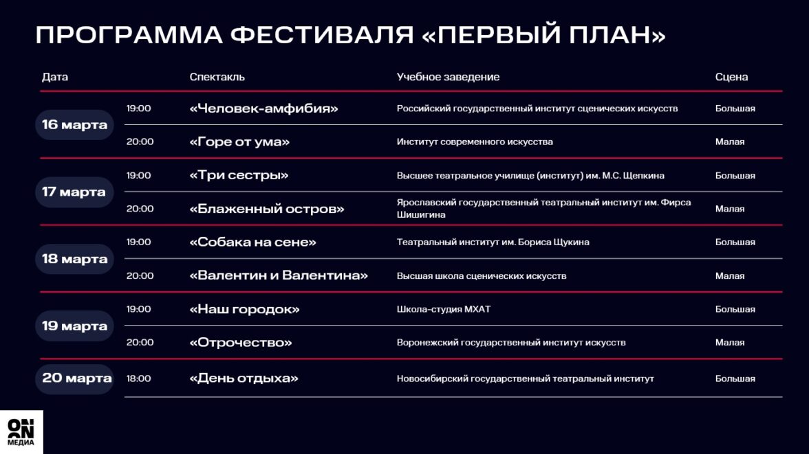 По замыслу организаторов, «Первый план» становится одним из важнейших культурных событий театрального сезона, доступным для широкой аудитории. Фестиваль продолжает свою миссию – создавать пространство для диалога между молодыми театральными коллективами, профессиональным сообществом и зрителями, которые стремятся открывать новые лица российского театра. Фестиваль проводит холдинг ON Медиа при поддержке Президентского фонда культурных инициатив (ПФКИ). Билеты на все спектакли продаются на платформе Ticketland.