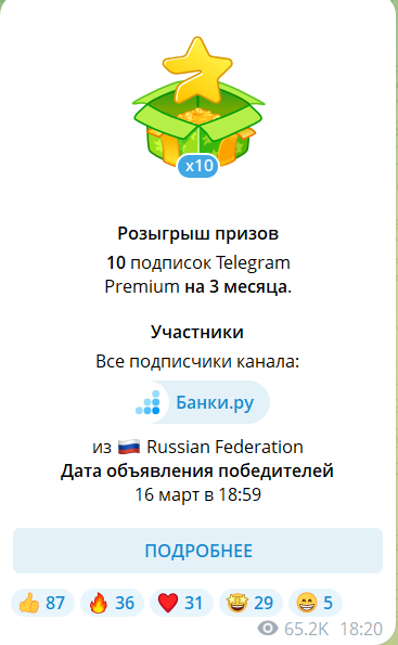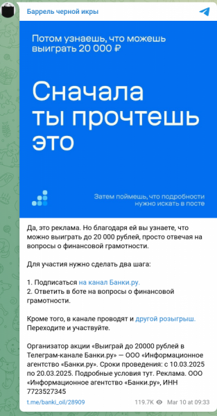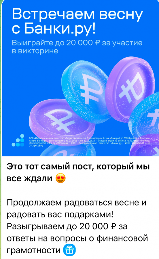 Спустя неделю мы запустили второй конкурс. В Telegram-канале «Банки.ру» опубликовали пост с подробными условиями конкурса, положением и ссылкой на чат-бот. В этот же день вышли посевы.