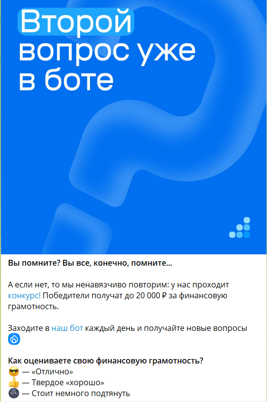 Важный аспект проведения конкурса — ежедневные напоминания о вопросах в канале «Банки.ру». Мы интегрировали их в выходящие в это время посты или делали отдельные публикации с креативными заходами.