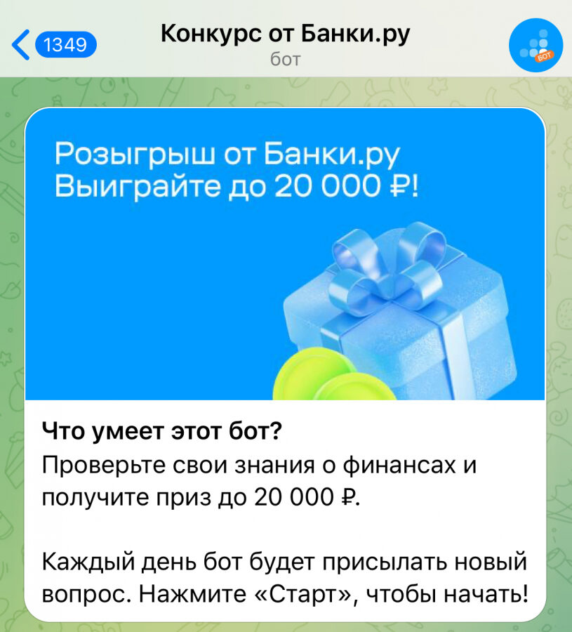 При переходе в бот пользователь мог стать участником: для этого требовалось подписаться на «Банки.ру» в Telegram. После этого каждый день на протяжении недели, участник получал вопросы по финансовой грамотности.