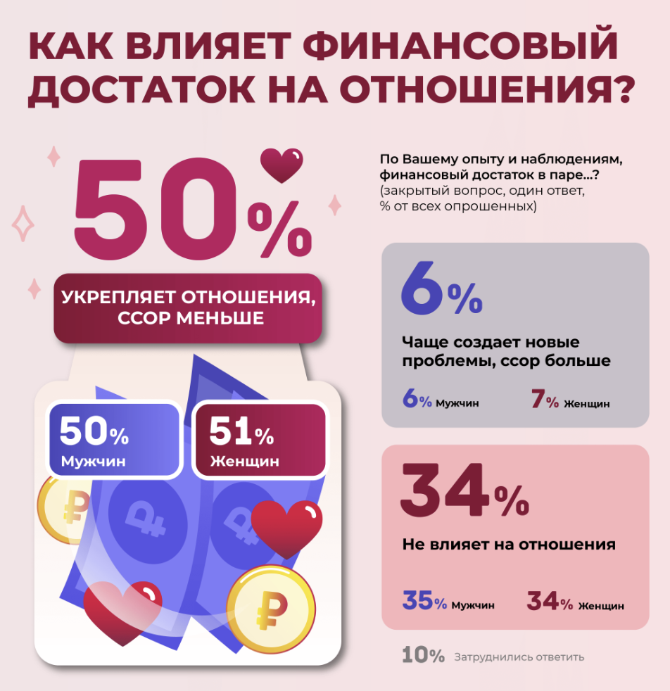 В ходе опроса ВЦИОМ на вопрос «По Вашему опыту и наблюдениям, финансовый достаток в паре…?» 50% опрошенных ответили «укрепляет отношения, ссор меньше». Каждый третий (34%) заявил, что деньги на отношения не влияют. Только один из шестнадцати опрошенных (6%) думает, что финансовый достаток создает новые проблемы, ссор бывает больше. Каждый десятый затруднился с ответом.