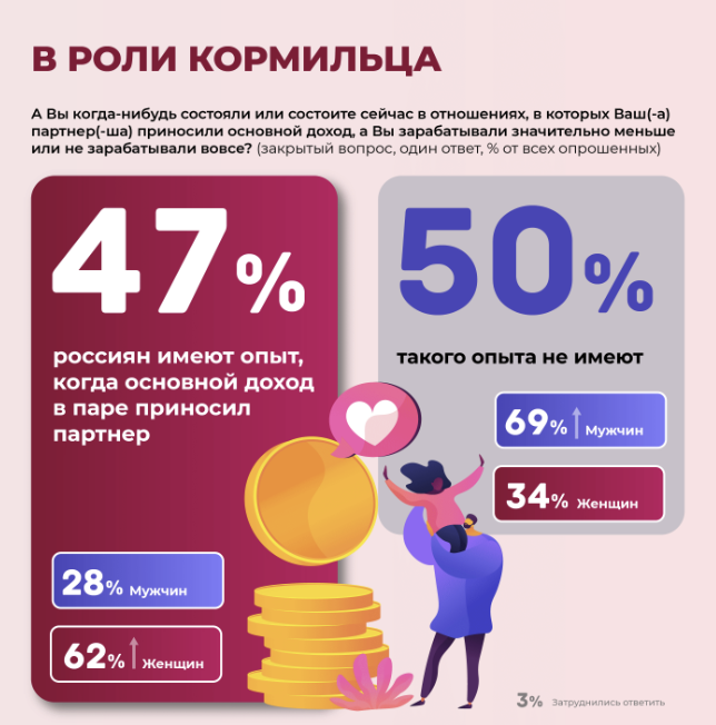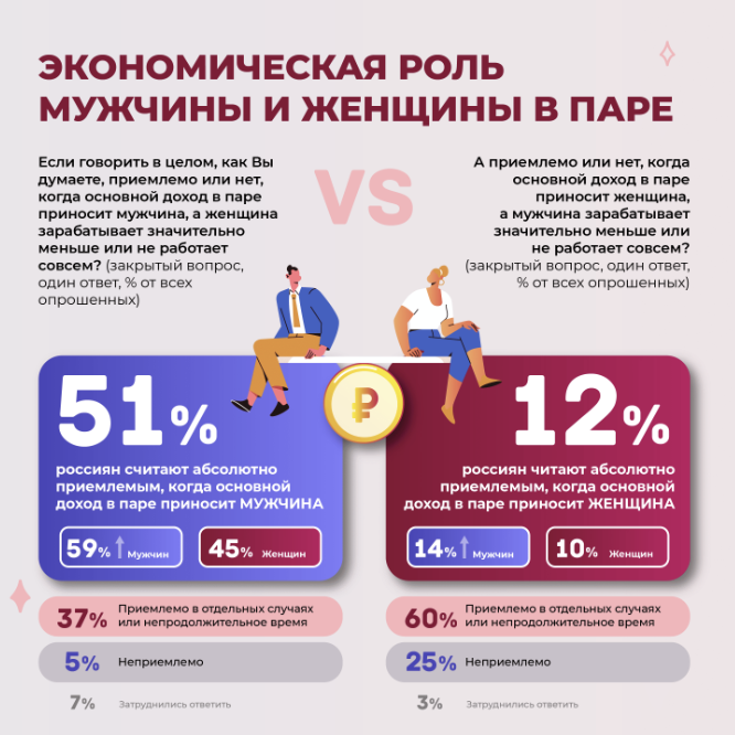 Половина (50%) россиян считает, что финансовый достаток укрепляет отношения. Только один из восьми (12%) считает приемлемым, когда основной добытчик в паре — женщина. Эти и другие цифры получены ВЦИОМ в результате опроса о финансовых отношениях в паре.