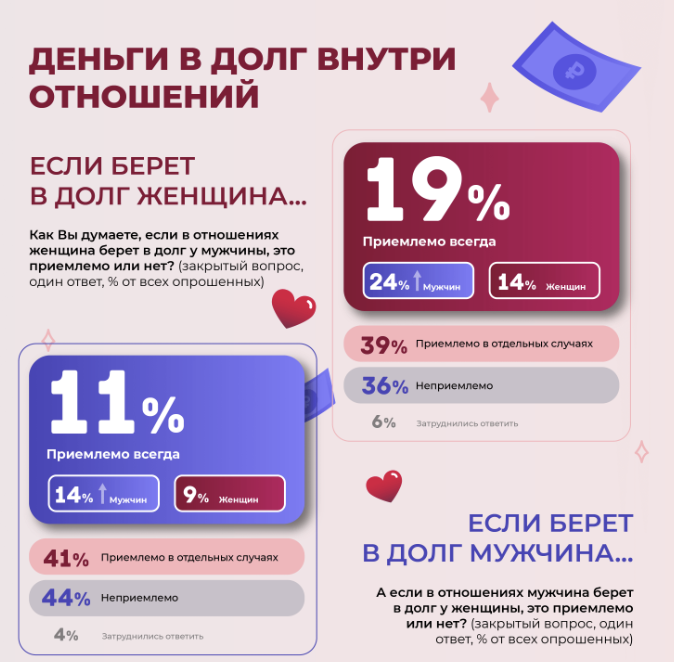 «Как Вы думаете, если в отношениях женщина берет в долг у мужчины, это приемлемо или нет?» На такой вопрос положительно ответил каждый пятый (19%). Четверо из десяти (39%) сочли, что это приемлемо в отдельных случаях. Каждый третий (36%) ответил «неприемлемо».