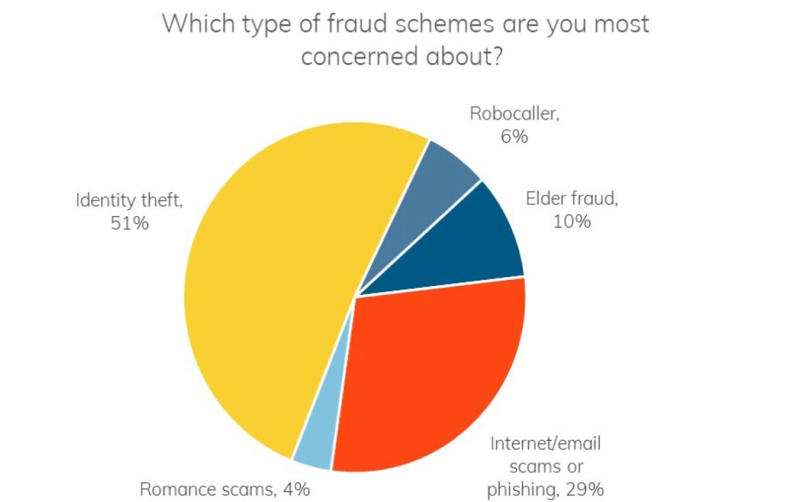 Ростом случаев мошенничества обеспокоены 39% американцев, а еще 51% — очень сильно обеспокоены. Больше всего опрошенных опасаются кражи личности — 51%. 29% опасаются жуликов, которые действуют через интернет и электронную почту, выманивая личные данные. У 10% вызывает беспокойство обман пожилых людей, у 6% — обзвон роботом. На последнем месте — страх перед жуликами, имитирующими романтические отношения, — 4%.