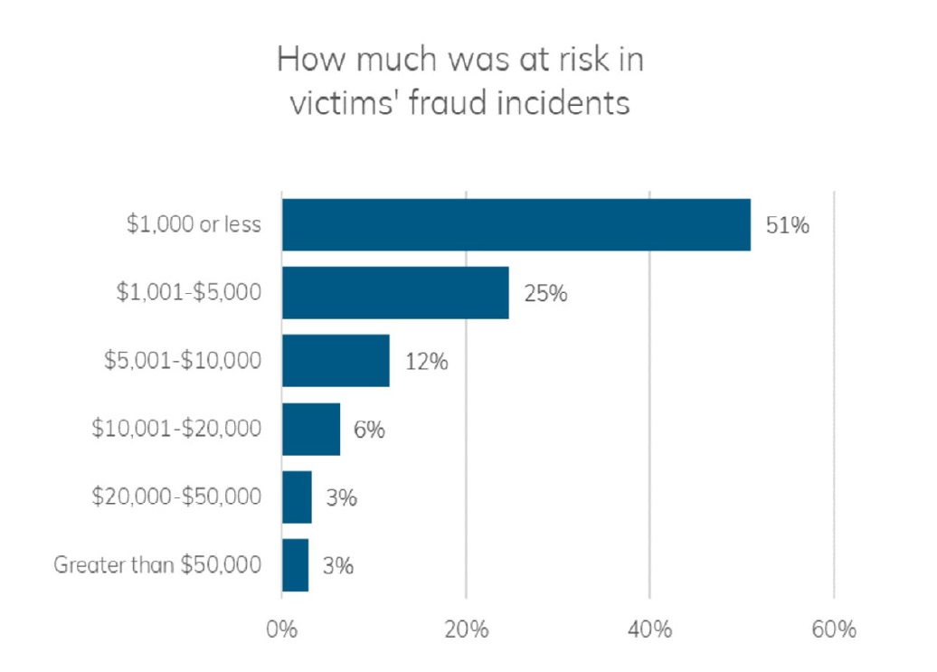 Чуть более, чем в половине случаев (51%), сумма, которая была потеряна или могла быть потеряна в результате мошеннической операции, не превышала $1000. В четверти случаев (25%) речь шла о сумме от $1001 до $5000. В 12% случаев — о сумме от $5001 до $10 тыс.. В 6% случаев — от $10 001 до $20 тыс. В остальных 6% случаях половина приходилась на суммы от $20 тыс. до $50 тыс., а вторая половина — на еще более крупные суммы.