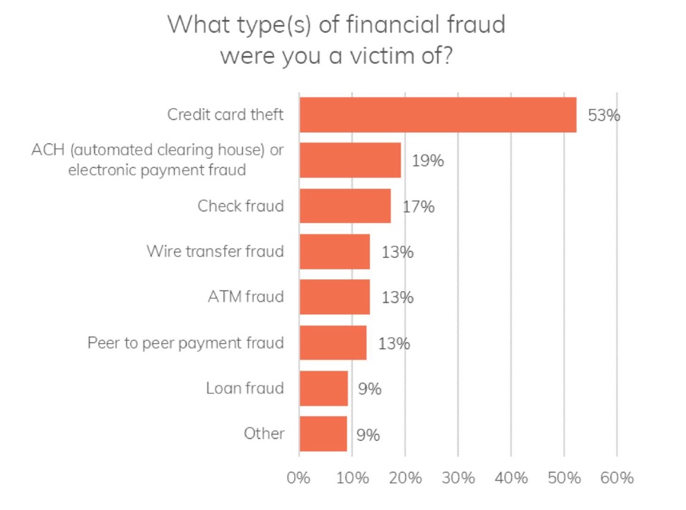 45% опрошенных сообщили, что сталкивались с финансовым мошенничеством, многие из них — неоднократно и с разными его видами. Те, кто сталкивался с финансовым мошенничеством, чаще всего сообщали о краже денег с кредитной карты — 53%. 19% сообщили о мошенничестве, связанном с различными видами электронных платежей. Дальше в порядке популярности у мошенников следуют: жульничество с чеками (19%), мошенничество с денежными переводами (17%), мошенничество с банкоматами и в двусторонних расчетах (по 13%), с кредитами (9%). На остальные виды мошенничества приходится 9% ответов тех, кто с ним сталкивался.