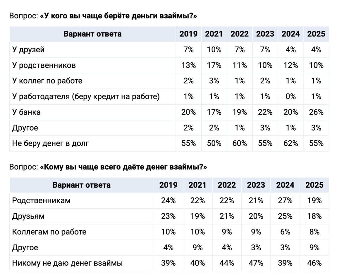 По сравнению с прошлым годом примерно в полтора раза меньшее число россиян стало давать денег взаймы родственникам (19% против 27%). Также почти в полтора раза снизилось число тех, кто дает взаймы друзьям (18% против 25%). Но при этом почему-то выросло число тех, кто готов дать денег взаймы коллеге — с 6% до 8%.