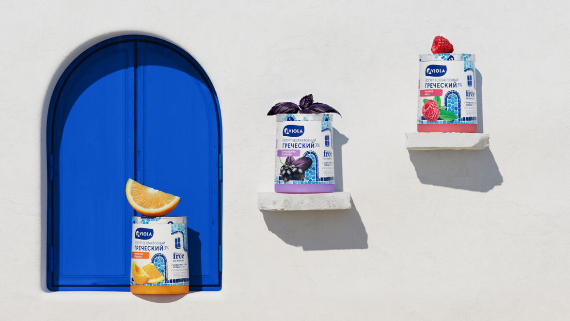 Мы разработали концепт «греческий город» в котором рождается целая история: где-то рядом море, улочки, лазурные ставни и двери, сине-голубая мозаика… Атмосфера греческого города, наполненного ароматами чистого воздуха и свежих цитрусов, отразилась в новых вкусах йогурта Viola.