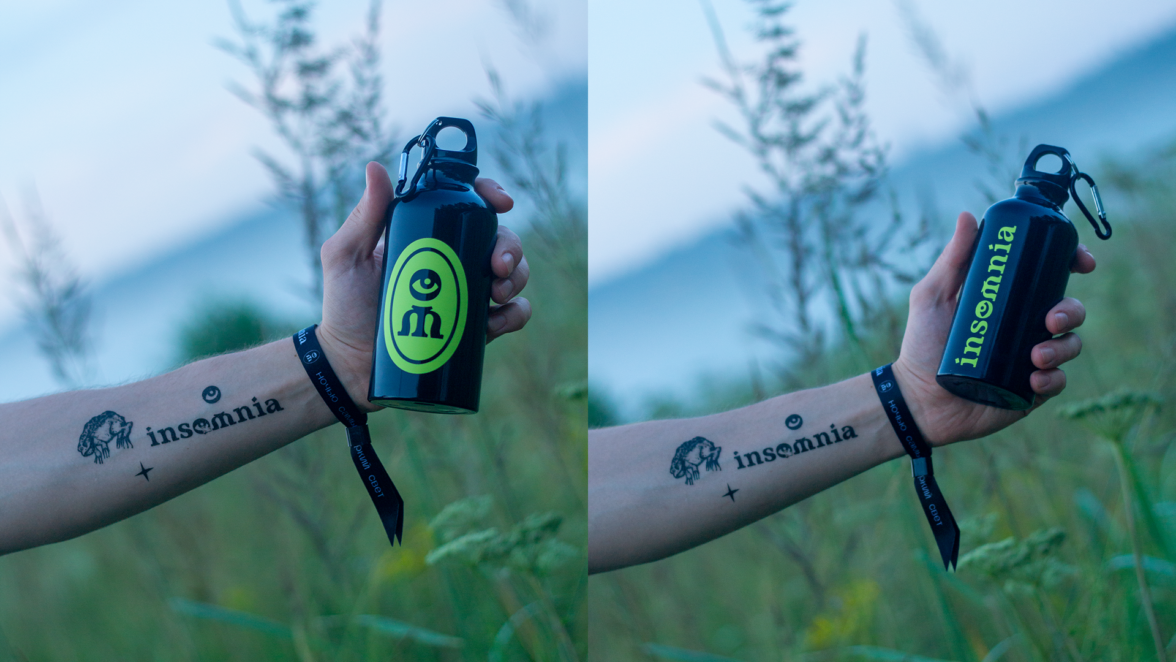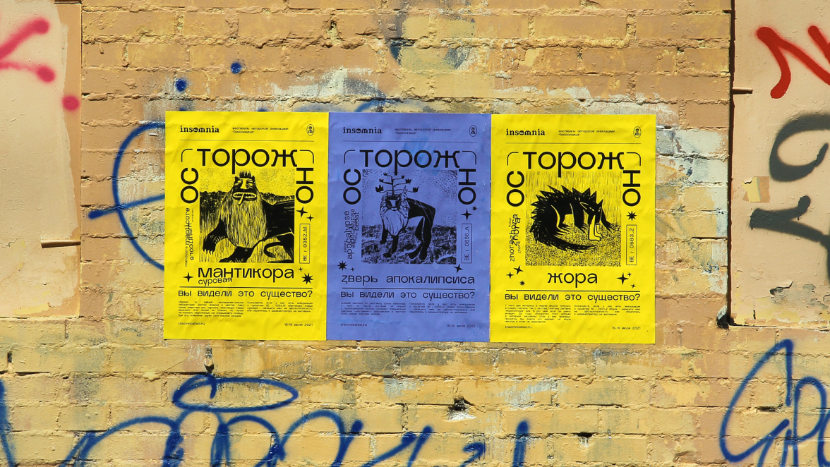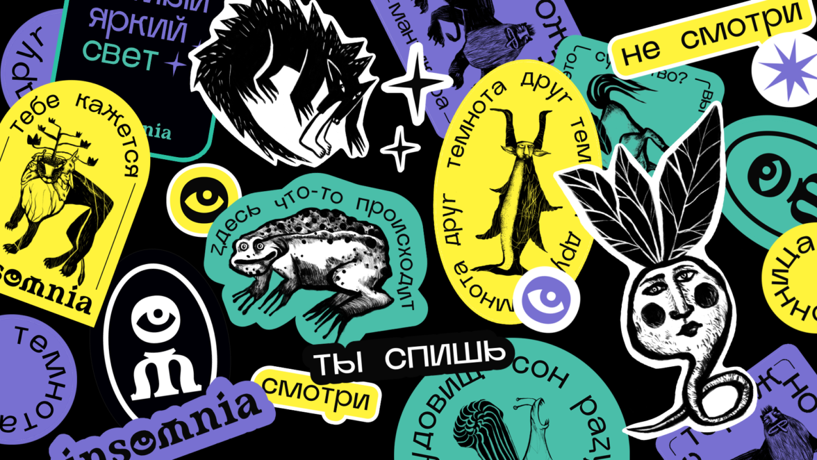 Настя рассматривала старинные манускрипты, искала подходящий образ для написания логотипа. На основе унциальных шрифтов она создала слово «Insomnia». Для фирменного стиля был выбран акцидентный шрифт Glock Grotesque. Он немного «шибанутый» в хорошем смысле слова: харизматичный, игривый, в нём русские и латинские знаки перемешаны и это производит впечатление некой потусторонности, взаимопроникновения двух миров.