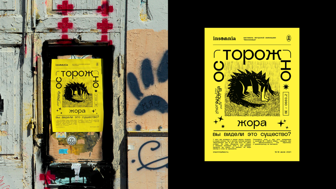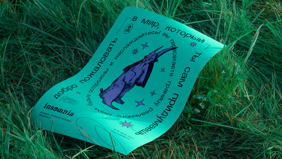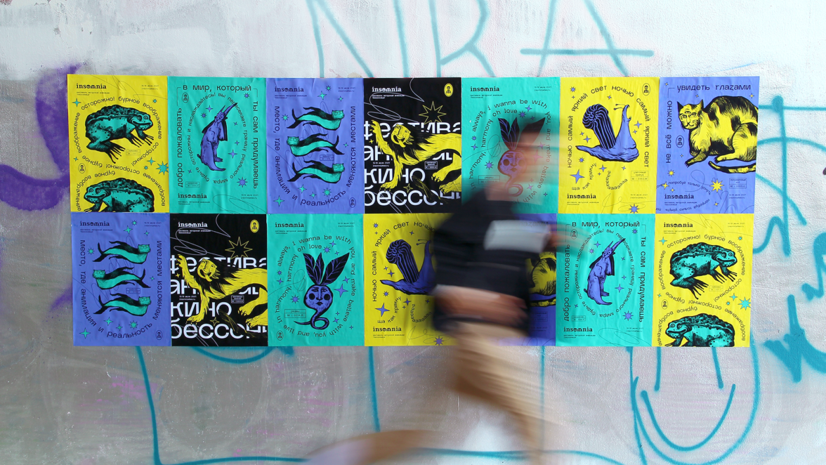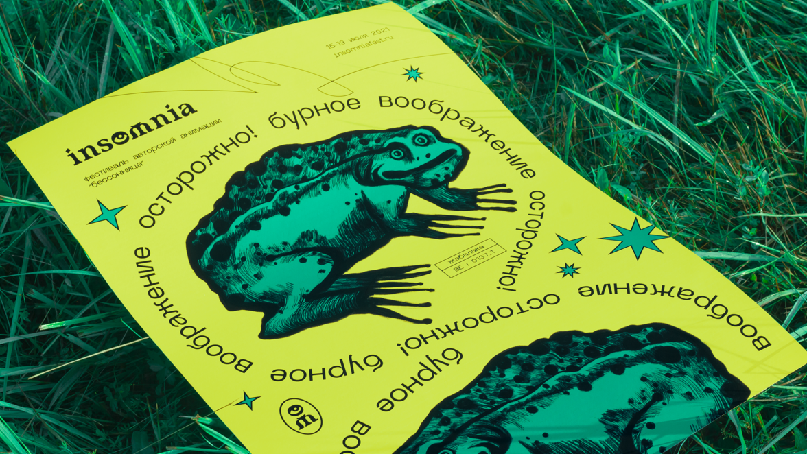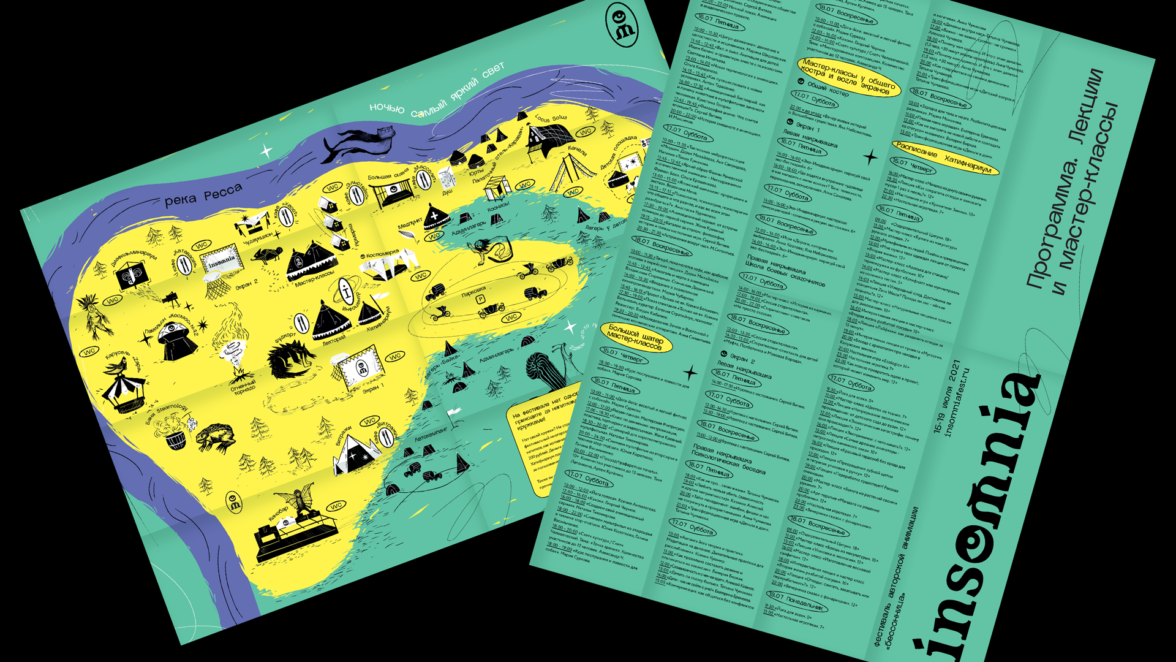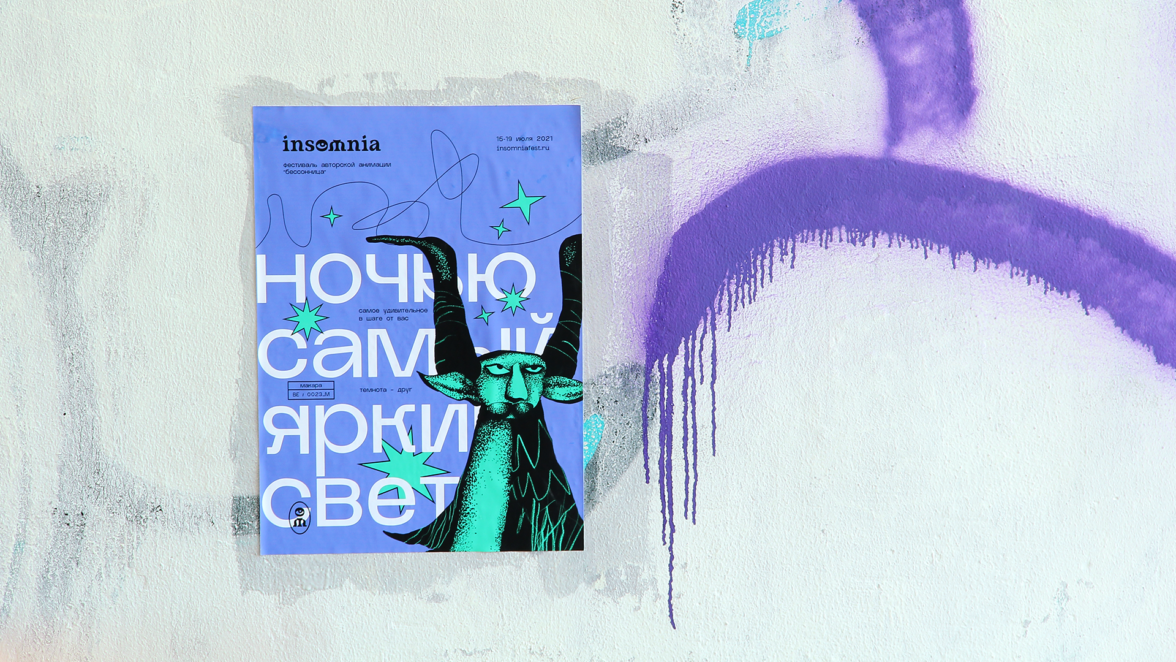 Бессонница — некоммерческий фестиваль авторской анимации со всего мира. Он проводится каждое лето в Калужской области энтузиастами, влюбленными в анимацию. В 2020 году фестиваль отменили (понятно почему). Но в 2021 команда организаторов была настроена провести его во что бы то ни стало. Мы предложили им проект в формате pro bono: с нас — концепция фестиваля, фирменный стиль и все макеты, а ребята не ограничивают нашу творческую свободу.